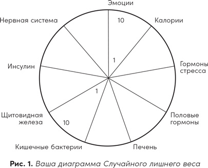 Определив области, в которых вам требуется помощь, вы сможете сосредоточиться на информации, наиболее значимой для вашего здоровья. После того как вы на протяжении месяца будете применять стратегии, предложенные в актуальных для вас разделах, вы сможете вернуться к своей диаграмме и использовать маркер другого цвета для отображения новых результатов. Необязательно стремиться к десятке во всех сегментах. Определите препятствия на пути к сжиганию жира и постарайтесь, чтобы закрашенных областей на диаграмме было больше. Доведите свои оценки (биохимию) до той точки, в которой ваше колесо похудения снова начнет вращаться, приводя к желаемым результатам в общей картине здоровья.