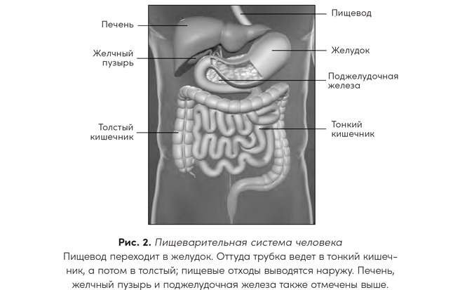 Пищеварительная система состоит из пищеварительного тракта большой длинной трубки (можете представить себе нечто похожее на шланг) и множества вспомогательных органов, включая печень, желчный пузырь и поджелудочную железу (рис. 2 поможет вам понять, как все устроено). Эта длинная трубка начинается у вас во рту, откуда пища движется по пищеводу и через клапан попадает в желудок. Затем она проходит через клапан в нижней части желудка в тонкую кишку, через тонкую кишку и илеоцекальный клапан в толстый кишечник, и в конце концов пищевые отходы выводятся из организма с противоположного конца пищеварительного тракта. Когда этот процесс налажен, вы выглядите и чувствуете себя великолепно. Но, если он нарушен, ситуация может быть прямо противоположной, и тогда, скорректировав его, вы в корне измените свою жизнь.