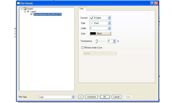 Теперь необходимо отформатировать саму кривую (см. рис. 1.12). Для этого необходимо дважды кликнуть на самой кривой мышкой. Откроется окно форматирования кривой. В этом окне выберите способ соединения элементов кривой Connect B-Spline. Это встроенная в программу функция сглаживания экспериментальных данных B-сплайнами. Затем выберите стиль кривой Style. Например, черточки Dash. Выберите толщину кривой Width, например, 2. Затем выберите цвет кривой Color. Например, Black. Нажмите Apply, затем OK. График должен принять вид, который представлен на рисунке 1.13.