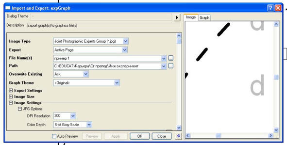 Для экспорта форматированного графика в графический файл необходимо в верхней панели выбрать пункт File и в ниспадающем меню выбрать пункт Export Graphs. Появиться окно работы с экспортом файла в диалоговом режиме. См. рис. 1.16. Выбирайте необходимый формат графического файла (Image Type). Как правило, необходимо осуществить экспорт в файл с расширением *.jpg. Укажите имя файла и путь к рабочему каталогу (File name и Path). Назовите файл, например, пример 1. Нажмите на раскрывающемся пункте Image Settings. Установите разрешение DPI Resolution 300 (как правило, требуется именно такое разрешение) и глубину цветности 24-bit Color (цветной рисунок) или 8-bit Gray Scale (полутоновый рисунок). Нажмите Preview, чтобы увидеть предварительный вид экспортируемого графика. Нажмите Apply. Нажмите OK.