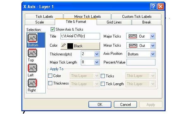 В открывшейся вкладке введите размер цифр на оси аргумента, например Point 20. Нажмите Apply. Откройте вкладку Title & Format (см. рис. 1.10). В открывшейся вкладке установите толщину горизонтальной оси Thickness, например, на значение 2,0. Нажмите Apply.