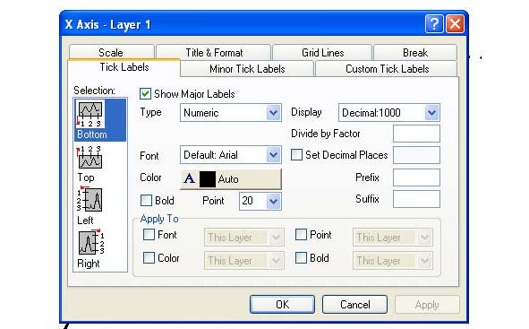 В открывшейся вкладке установите начальное и конечное значение аргумента From 1, To 5. Установите приращение аргумента Increment (шаг, с которым будут отображаться значения аргумента под горизонтальной осью). Пусть приращение аргумента будет равно Increment 1. Установите количество второстепенных делений на шкале горизонтальной оси. Пусть # Minor Ticks 1. Нажмите Apply. Затем выберите вкладку Tick Labels (см. рис. 1.9).