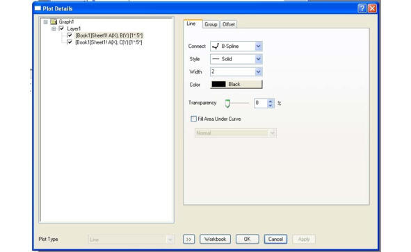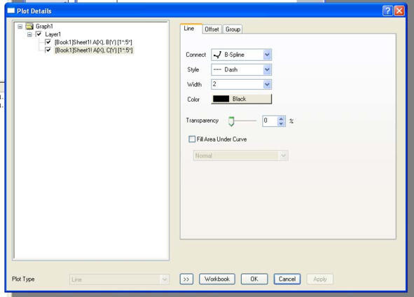 Затем следует выбрать вкладку Line. В левой части открывшегося окна активировать необходимую кривую. Сначала активируем столбец B. Укажем в правой части окна параметры форматирования кривой. Нажмем кнопку Apply. Вид вкладки представлен на рисунке 1.47.