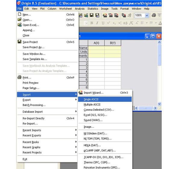 Затем необходимо выполнить экспорт данных из файлов результатов численного моделирования (file1.dat и file2.dat). Для этого возможно два пути. Первый выполнить экспорт файлов поочередно. Для экспорта первого файла в верхней панели программы следует выбрать пункт File. В ниспадающем меню необходимо выбрать пункт Import. В боковом меню необходимо выбрать пункт Single ASCII (см. рисунок 1.52).