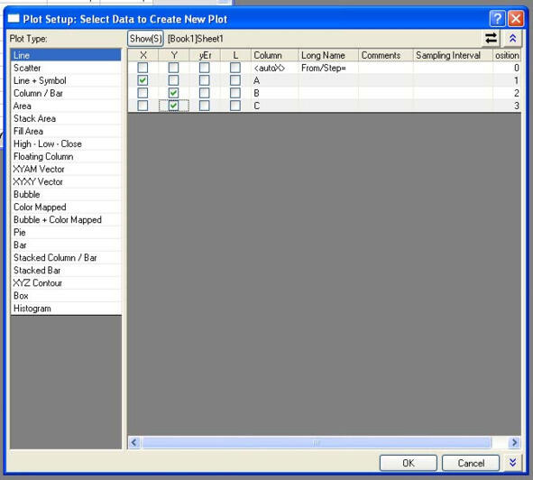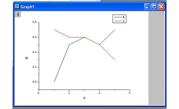 Возможны различные сценарии построения нескольких кривых. Следует в верхней панели выбрать пункт Plot. В ниспадающем меню выберете пункт Line. В открывшемся боковом меню также необходимо выбрать пункт Line. Откроется окно управления графиком, в котором появится еще один столбец. Необходимо поставить в соответствие X столбец А, Y столбцы B, C. Затем следует нажать кнопку ОК. Вид окна представлен на рисунке 1.43.