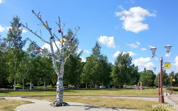 Самое любимое место на набережной у петрозаводчан у Дерева желаний. Всё потому, что у него есть настоящее ухо, в которое можно прошептать заветное желание. Такое волшебное дерево подарили побратимы из шведского города Умео. В Швеции есть легенда о черном дереве с колокольчиками, исполняющем желания. Возможно, эта скульптура и вправду магическая, ведь под стеклотканью спрятана настоящая сосна.