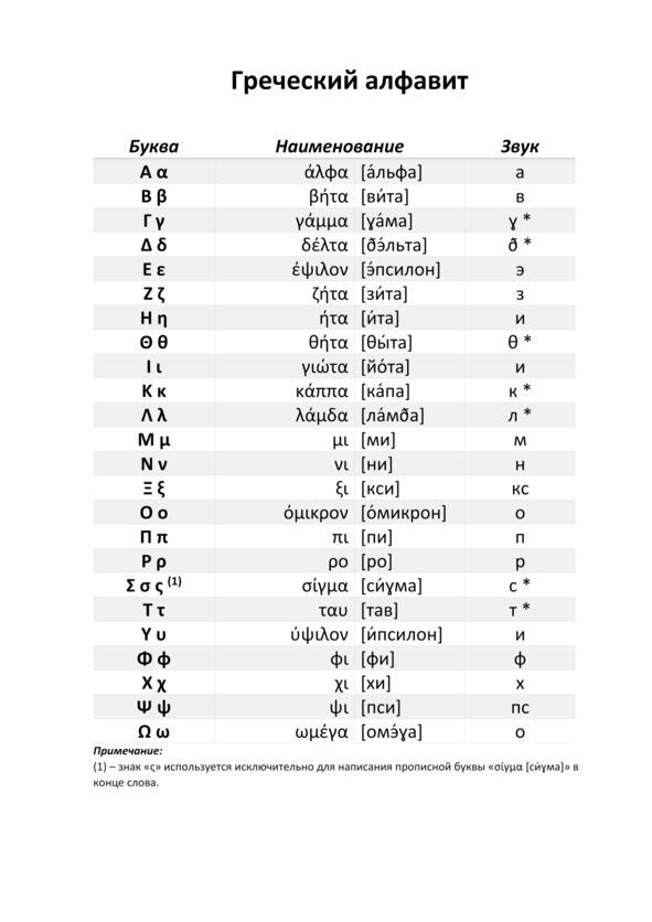 Чтение большинства букв греческого алфавита не представляет особых трудностей, так как они передают звуки, близкие звукам русского языка. В таблице «Алфавит» в колонке «Произношение» показаны буквы русского алфавита, звучание которых соответствует звукам греческого языка. Однако некоторые буквы обозначают звуки, не имеющие соответствия в русском языке, а некоторые звуки, хотя и похожи на русские, произносятся несколько своеобразно. В колонке «Произношение» эти звуки выделены звёздочками.