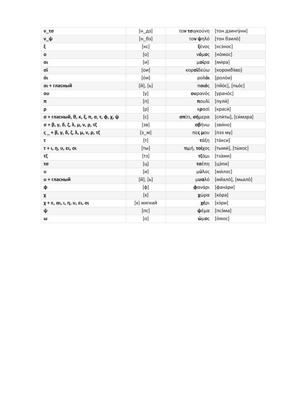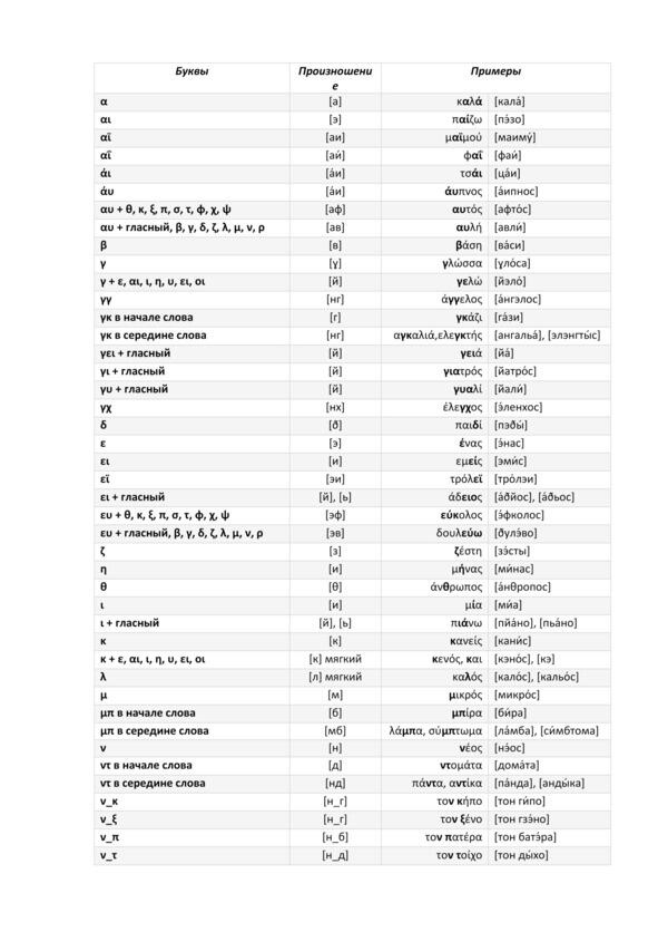 Нет смысла в зубрёжке таблицы. Лучше обращайтесь к этой таблице каждый раз, когда Вы встречаетесь с необходимостью произнести слово или фразу на греческом языке.