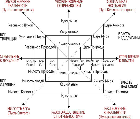 Это стремление охватывает все три ипостаси Бога: Бога-отца, понимаемого как прародитель природы, Бога-сына, как покровителя человечества, и Бога-духа святого, как прародителя Вселенной (космоса).