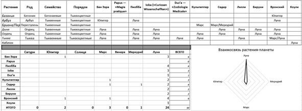 На диаграмме частот упоминаний растений семейства Тыквенные в связке с планетами авторов, труды которых мы взяли за основу исследования, видна четкая тенденция. Исключением является растение Бриония, которое Кульпепер относит к Марсу, а Седир к Меркурию, что на наш взгляд является ошибкой, потому что переступень обладает теми же свойствами, что и другие растения этого таксона. К этому роду относятся 9 видов, и только один из них характеризуется цветом Bryonia alba, где alba описывает цвет, в этом случае белый.