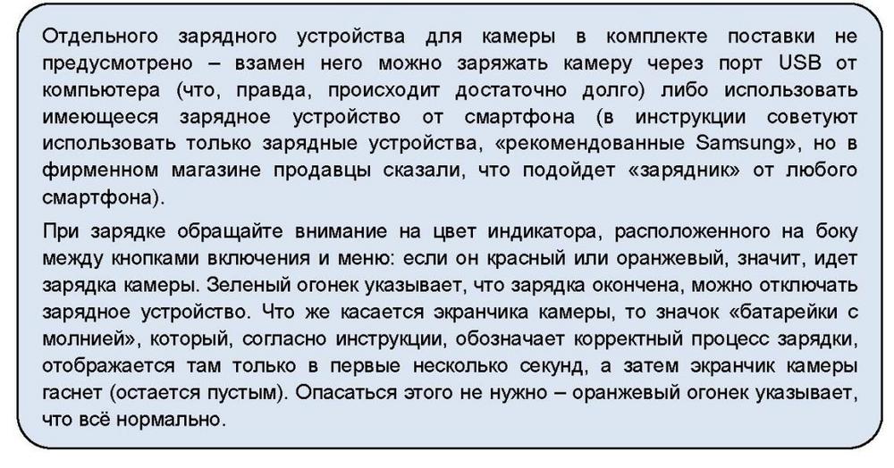 Во-первых, это отсутствие встроенной флеш-памяти: запись фото и видео производится на устанавливаемую в соответствующее гнездо карту памяти micro SD емкостью до 256 Гб, причем скорость обмена должна обеспечиваться достаточно высокая. В Samsung рекомендуют использовать их фирменную карточку памяти нового стандарта Pro, специально предназначенную для записи видео в формате 4К UHD (UHS-I Speed Class 3 (U3), Class 10 со скоростью чтения до 90 млн байт/с и записи до 80 млн байт/с). Так что, приобретая саму камеру, нужно быть готовым тут же выложить дополнительно достаточно приличную сумму за высокоскоростную карту памяти объемом минимум 64 Гб (соответствует 4 часам видео): без установки карты памяти камера не работает вообще (выводит при включении соответствующую пиктограмму на свой экранчик).
