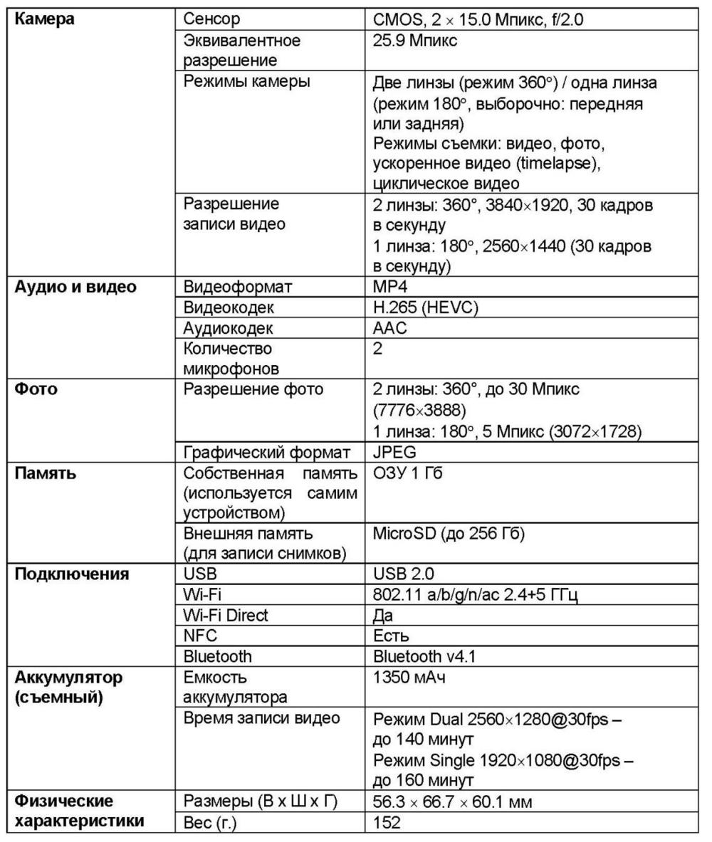 1. Максимальное разрешение при записи 360-градусного видео формата MP4 составляет 3840х1920 при частоте 30 кадров в секунду, а максимальное разрешение 360-градусного фото 7776х3888. Для сравнения можно в качестве примера привести камеру Sphericam 2, которая обеспечивает разрешение видео до 4096х2048, но стоит при этом около 180 тысяч рублей.