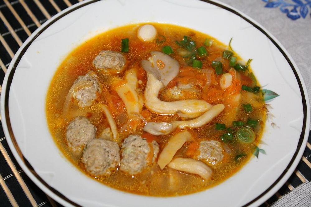 Грибы опустить в кипящую воду, бланшировать 2 минуты, отцедить, нарезать вдоль полосками. Воду не использовать. В сковороде разогреть масло, обжарить лук до прозрачности, добавить тертую морковь и грибы, тушить под крышкой на медленном огне около 8-10 минут, добавить пасту из моркови и томатов, тушить еще несколько минут. С помидора удалить кожу, мелко нарезать, положить в сковороду к грибам. Тушить на медленном огне до готовности грибов. В случае необходимости добавить в сковороду 2-3 столовые ложки воды. Посолить, приправить пряностями, перемешать. Зажарку снять со сковороды. В фарш добавить яйцо, рубленый лук и чеснок, соль, пряности, вымешать, сформовать фрикадельки. В суповой кастрюле довести до кипения подсоленную воду, опустить фрикадельки, варить около 10 минут. В суп добавить зажарку.
