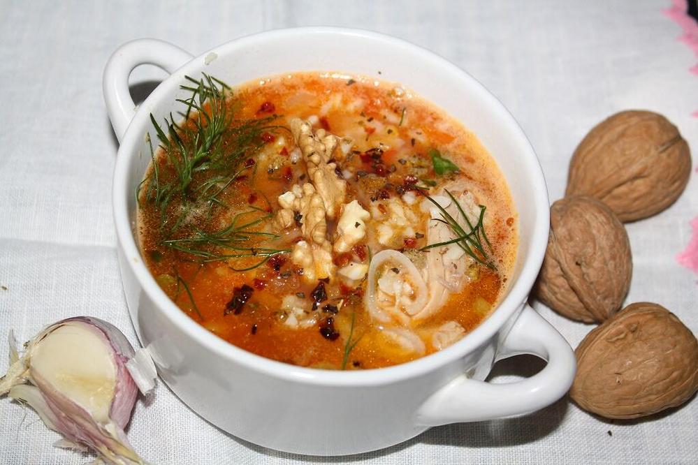 При подаче гарнировать суп отварным мясом и зеленью кинзы.