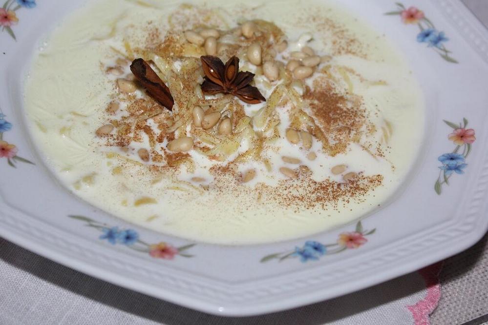 25 гр готовой домашней лапши, 0,5 литра цельного молока, 1 столовая ложка кедровых орехов, по щепотке молотой корицы и бадьяна.