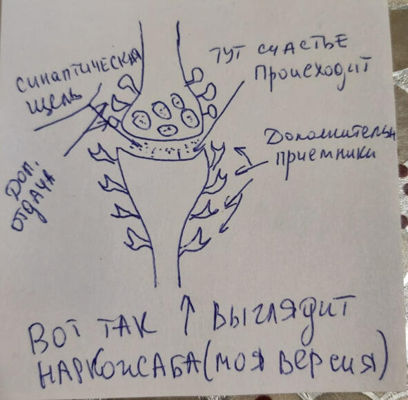 В идеале, в трезвости, у человека нет маленьких дополнительных приемников и точек большей отдачи медиаторов для усиления чувствования и увеличения чуда (кайфа), но у зависимого, под воздействием хим. веществ эти дополнительные приемники и выделители отрастают. Вот именно это и представляет из себя наркожабу, которой всегда мало кайфа, и которая не умирает при окончании активного употребления, а лишь засыпает.