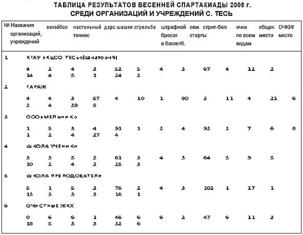 «Спортивная весна 2008» в с. Тесь. Шестого апреля завершилась весенняя спартакиада в с. Тесь. В играх участвовали спортсмены семи сельских организаций и учреждений (МОУ «Тесинская СОШ» 10, КГАУ «КЦСО «Тесь» (разные цеха, в т.ч. санаторий, гараж), коммунальщики, ОАО «Искра Ленина», ООО «Мельник»), мужчины, юноши, девушки, женщины. В каждой команде по четыре мужчины и по две женщины, в т.ч. более сорока участников защищали спортивную честь своих организаций.