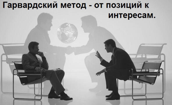 Давайте все же разбираться. В чем заключается Гарвардский метод ведения переговоров. Основная предпосылка этой модели ведения переговоров заключается в том, что переговоры следует вести не с точки зрения позиций переговорщиков, а сосредотачиваться на их интересах. И что только такие переговоры могут привести к выигрышу обеих сторон.