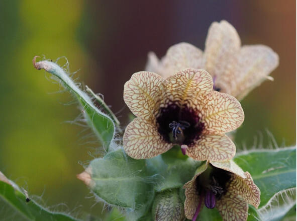 Цветки крупные, грязно-жёлтого цвета с фиолетовыми прожилками. Чашечка колокольчатая, при плодах увеличенная, твердеющая, с резко выдающимися жилками. Венчик воронковидный или трубчато-воронковидный, с пяти лопастным, простертым отгибом, спереди с глубоким разрезом. Во время цветения от растения идет довольно неприятный запах. Даже животные, у которых гораздо чувствительнее обоняние, обходят белену стороной.