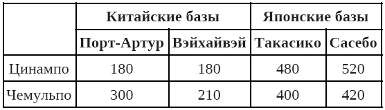 Базами японского флота для действий в Корее являлись Сасебо и Такасико (остров Цусима). Основным недостатком системы базирования было большое удаление баз от основного района театра военных действий.
