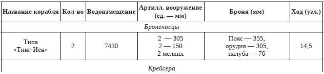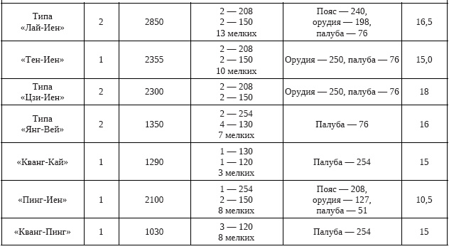 3. Большинство японских кораблей имело слабое бронирование. Китайские крейсера обладали тем же недостатком, но наличие в составе китайского флота двух броненосцев с сильной артиллерией и бронированием пояса и казематов давало им крупное преимущество.