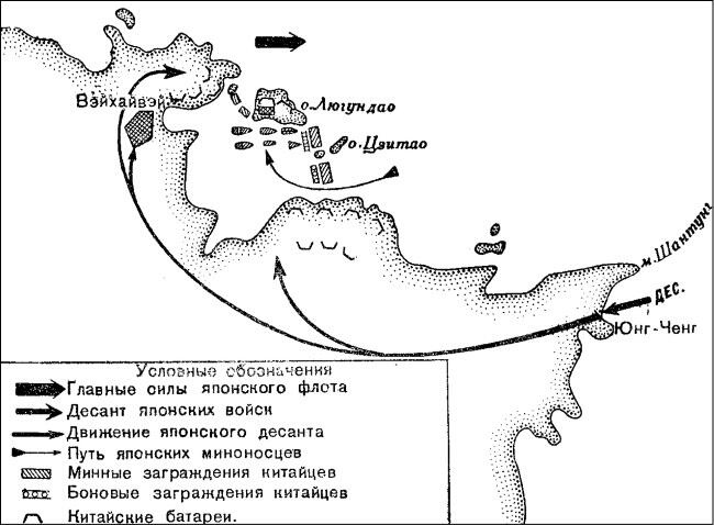 База Вэйхайвэй, заложенная, как и Порт-Артур, в 1880 г., являлась отличной якорной стоянкой для всего китайского флота. Вместительная бухта Вэйхайвэй была прекрасно защищена с востока островами Люгундао и Цзитао, а с севера далеко выдающимся в море горным отрогом. Почти отвесные берега материка и островов достигали высоты 100 м. Оба прохода в бухту были заграждены донными минами и перекрыты бонами. Укрепления приморского фронта состояли из 15 фортов, вооруженных 61 орудием крупного калибра. Долговременные сооружения со стороны суши отсутствовали. Гарнизон Вэйхайвэя насчитывал 80009000 человек. В Вэйхайвэе дислоцировалась вся китайская Северная эскадра. В отличие от Порт-Артура в Вэйхайвэе флот благодаря большой водной акватории и широким входам мог принять участие в обороне, прикрываясь линией минных и боновых заграждений. Основным недостатком в обороне Вэйхайвэя было то, что отсутствовал постоянный базовый дозор. Японцы повторили тот же прием, что и у Порт-Артура, нанеся главный удар по Вэйхайвэю с суши.