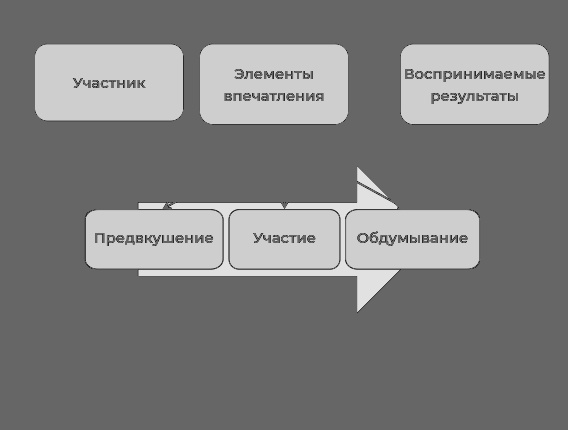 Исходя из сочетания основных составляющих, представленных на рис. 1.1, мы предлагаем следующее определение впечатления: впечатление есть единственный в своем роде феномен взаимодействия как эффект сознательного понимания участника и осмысленной интерпретации его элементов, кульминацией которого становятся личностно воспринимаемые результаты и воспоминания.