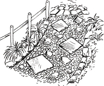 Сочетания некоторых видов покрытий выглядят весьма декоративно, например гравия и каменного мощения, гравия и бетонных плит, гравия и деревянного настила. Мягкие покрытия дорожек, такие как кора, галька или гравий, обязательно требуют бордюра из плит, кирпича, дерева или камня (рис. 2), иначе их придется постоянно подправлять.