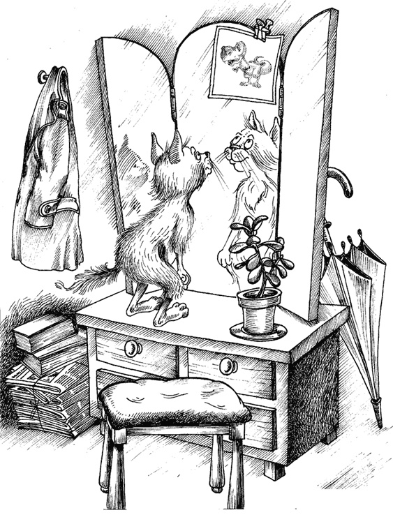 Он забрался на тумбочку трельяжа, встал на задние лапы, открыл пасть и ощетинился. Ну чем не динозавр? И зубы острые, и лапы передние когтистые, и хвост не такой уж тонкий. Митька решил зарычать, но вместо этого из грозной, как он видел, пасти выплыло тонкое мяуканье. «Так уж точно никого не напугаешь. И если внимательно приглядеться, то и пасть не такая, как у динозавра, длинная, да и зубов маловато будет. Хотя мне моих хватает для ловли мышей, крыс и прочих вредителей. А может, пасть удлинить? Для этого нужно найти хорошего хирурга. Зубы дело тоже наживное, рёв можно записать на айфон. И надо ещё выучиться бегать на двух лапах хищные динозавры именно так передвигались. Итак, с сегодняшнего дня я представитель древнейшего динозаврового рода. Только пёстрый».