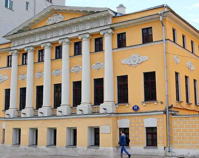 С этого времени на Пятницкой строятся дома в стиле Екатерининской классики и камерного, уютного Александровского ампира, хорошим примером которого служит дом 18. Это бывшая городская усадьба «послепожарной» Москвы 1812 года, созданная архитектором Осипом Бове. Прекрасен ее фасад с лепными украшениями в форме медальонов, с портиком в шесть белых ионических полуколонн. Хорошо сохранились и пилоны въездных ворот.
