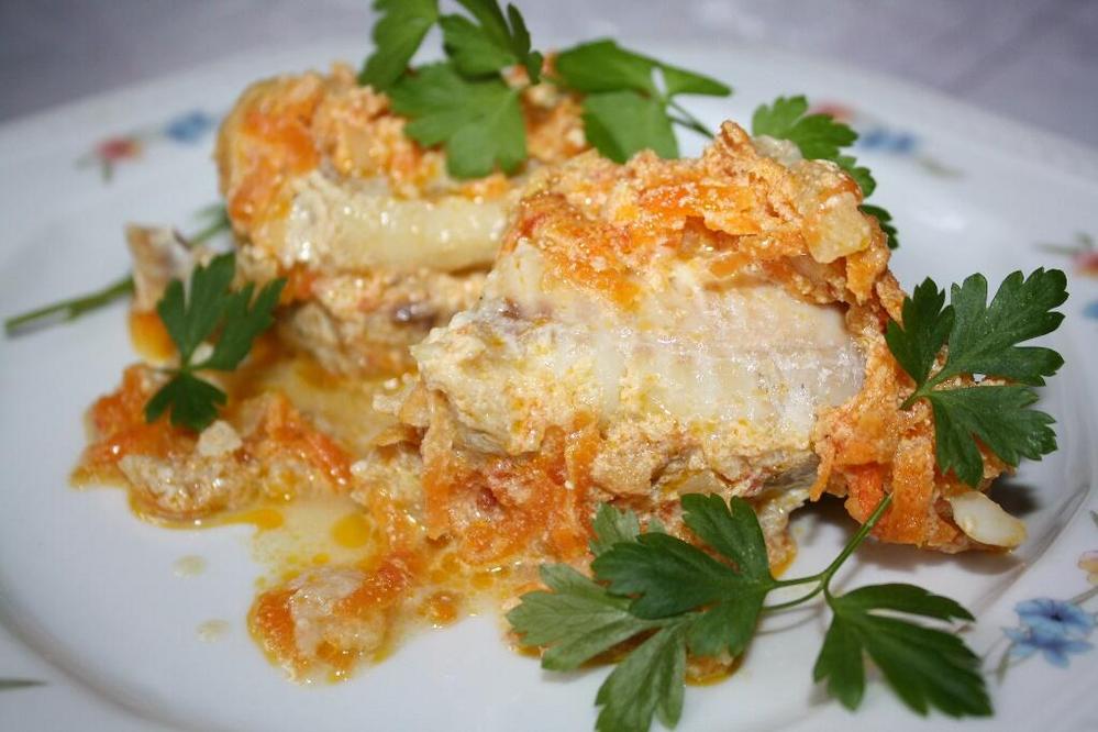 1,2 потрошенной, замороженной рыбы, по 100 гр репчатого лука и моркови, 30-40 гр сливочного масла, по 100 мл сметаны и молока, 1 столовая ложка домашних хлебных крошек из белого батона, соль, сахар, пряности по вкусу (перец чили, сушеный корень имбиря, сушеные травы петрушка, укроп, майоран или др).