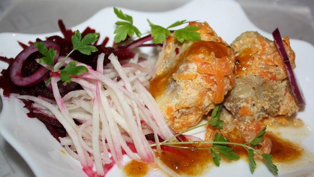 Рыбу обмыть, тщательно удалить из брюшины черную пленку, обрезать спинные и брюшные плавники. Надрезать кожу рыбы вдоль плавников (верхних и нижних), снять кожу, выдернуть плавники. Рыбу нарезать порционными кусками.