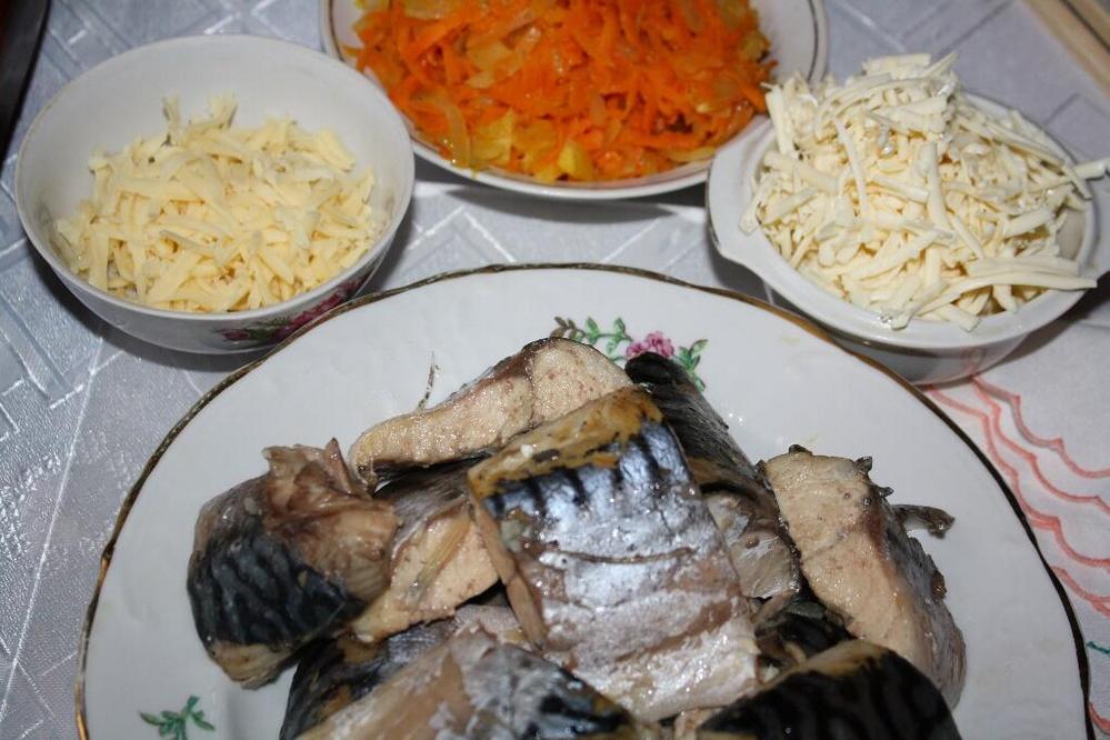 1,2 кг замороженной скумбрии (2 тушки), по 200 гр моркови и репчатого лука, 90 гр плавленого сыра, 30 гр твердого сыра, по 3 столовые ложки сметаны и острого томатного соуса, около 50 мл растительного масла, по 1 стакану (200 мл) маринада из банки с маринованными огурцами и воды, пряности по вкусу (например, 2-3 лавровых листика, 2-3 чешуйки от красного лука, по 1-2 высушенного листика дуба и смородины, по 2-3 горошине черного и душистого перца и можжевельника, по ломтику апельсина и лимона с цедрой), соль по вкусу.