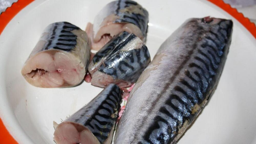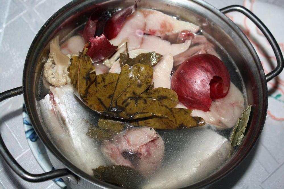Скумбрию выдержать в прохладном месте до полузамороженного состояния. Рыбу выпотрошить, удалить голову, хвост и плавники, кожу, удалить черную пленку брюшины. Тушки рыбы крупно нарезать (например, на 4 части), залить смесью маринада и воды, добавить листья и пряности. Варить после закипания около 7 минут. Рыбу отцедить, удалить кости.