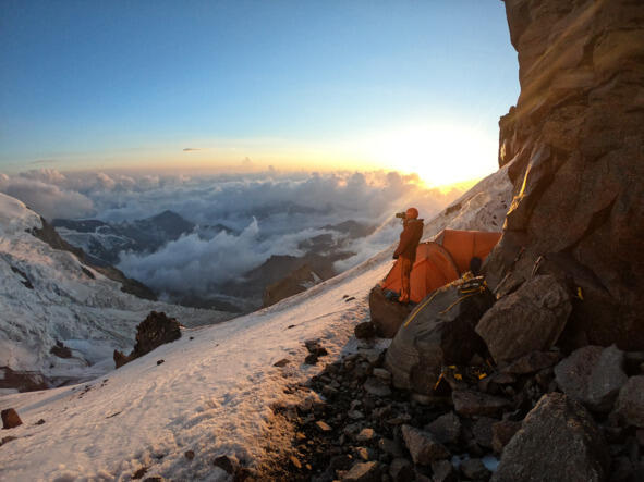 А бывает по-другому. Солнце уходит не за гору оно медленно, спокойно ложится в ущелье. И ве́чера тогда становится больше, можно дождаться золотого, красного и даже малинового заката. Но тот закат не главное! Главное снова на другой стороне. Заснеженные вершины вдруг расцветают всеми оттенками розового и голубого. Розового, светящегося где гор коснулись кисти лучей заходящего солнца. Голубого, холодного откуда солнечные лучи уже ушли, где наступила ночь. Чистый Рерих! Увидеть такое можно на Ленина с севера, из Киргизии. Или на Эльбрусе с запада. Впрочем, на Эльбрусе можно многое увидеть: восходы, закаты, лавины они тоже бывают завораживающе красивы. А какие там грозы!