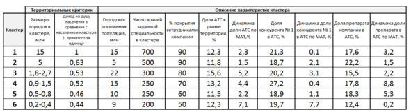 Проведенный несколько лет назад тщательный анализ жизни в конкурентных группах, в которых на рынке присутствует компания, показал, что многие города с точки зрения врачебных привычек выписывать определенные бренды ведут себя одинаково, будучи географически расположенные в различных регионах страны. Так, например, дорогостоящие антигистаминные препараты (они хоть и ОТС в большинстве своём, но очень широко выписываются врачами) отлично продаются в 2-х столицах и в городах с населением менее 400 тысяч в сравнении с поведением своей конкурентной группы. При этом дешевые аналоги продаются неплохо в городах с населением от 500 тысяч до миллиона и в миллионных агломерациях. Возникает вопрос надо ли одинаково продолжать работать в городах с разной ситуацией в реализации дорогих антигистаминных препаратов? Думаю, что нет. Кроме того, если в 2-х столицах есть все представители конкурирующих компаний, то в городах с населением менее 400 тысяч только фармгигантов, и вполне может быть, что другие антигистаминные, кроме дорогих, продвигаемых силами вашего представителя, уже нашли достойное место в арсенале врачей.