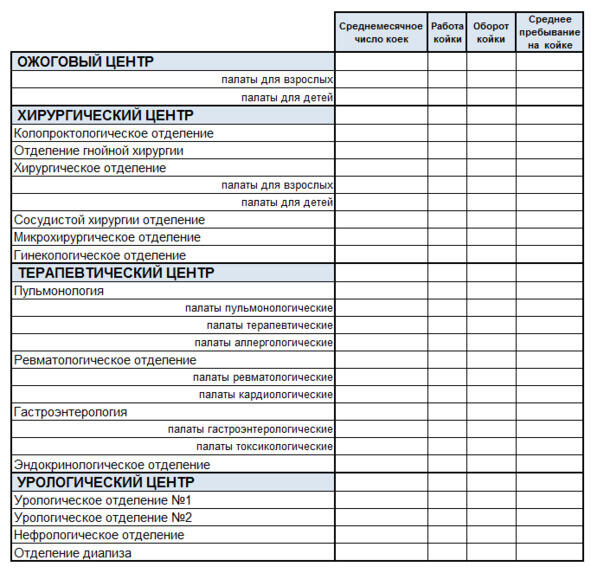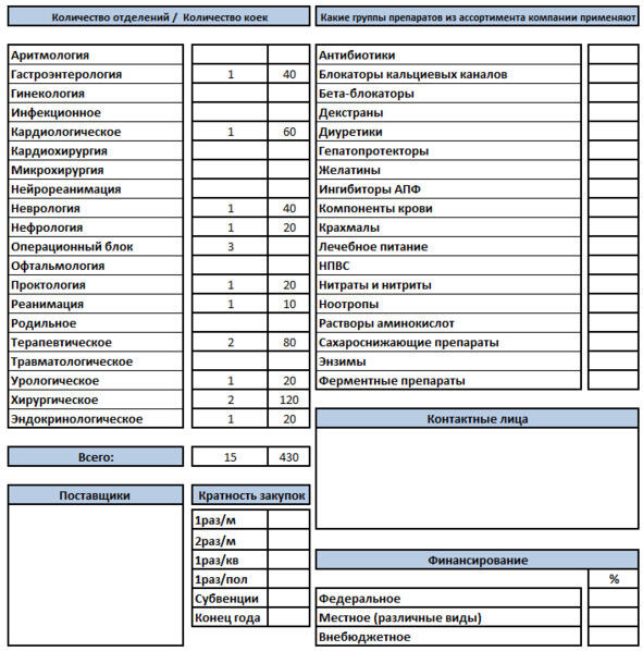 При работе с крупными стационарами имеет смысл заполнять паспорт ЛПУ (данные находятся, как правило, в открытом доступе; если чего-то нет не страшно, главное понять коечную мощность, оборачиваемость койки и профиль отделений):
