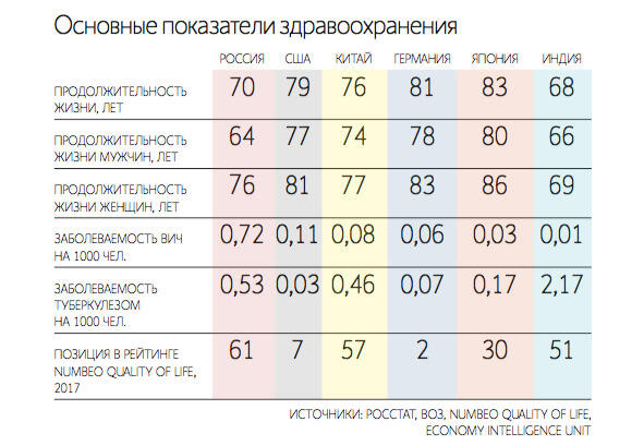 В этой же статье (от 14 июня 2018) приводятся и другие факты 5: «Взглянув на российскую систему здравоохранения глазами всех «участников процесса», аналитики BCG обнаружили проблемы на всех уровнях. У семей она вызывает чувство тревоги, пишут они: медицинские услуги могут оказаться разорительны для бюджета, на прием попасть трудно, врач может попасться низкоквалифицированный, а оборудования и лекарств и вовсе не оказаться. 31% населения сталкивались с требованием оплатить формально бесплатные услуги и лекарства, 37% были недовольны врачами, а 56% сидят в очередях. При этом среднестатистический россиянин болеет 20% своей жизни.