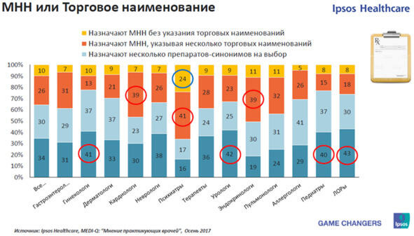 По специальностям тоже не всё одинаково: МНН без торгового названия в наибольшем числе случаев выписывают психиатры аж в 24% случаев против максимум 11% у всех остальных. То ли психиатры самые дисциплинированные, то ли есть на то ещё какие причины, но это так. У меня есть серьёзные сомнения в том, что фармацевты в аптеках прекрасно разбираются в нейролептиках, анксиолитиках, антиконвульсантах и прочем психиатрическом арсенале.