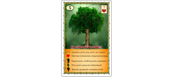 Дерево не только дарит прохладу в жаркий солнечный день, но является ещё и «лёгкими» нашей планеты. Без деревьев и лесов на Земле не было бы жизни. Дерево лечит человека своими соками, смолой, листьями, плодами и энергией. Некоторые деревья отдают свою энергию, а другие, наоборот, впитывают чужую. Оно может забрать на себя ваши проблемы или, наоборот, отдать вам свою энергию для поддержания ваших сил. Этим успешно пользуются те, кто знает, как и с каким деревом нужно общаться. В обмен на свою помощь, Дереву от вас ничего не нужно, оно самодостаточно. Отсюда основной смысл этой карты благотворность, здоровье, жизненность, целительство. Отмечу, что карта Дерево символизирует именно здоровье, а не медицину. Современная медицина больше относится к болезням, а не к здоровью, и почти всегда медицинские услуги оказываются за деньги. Поэтому для меня традиционная медицина представлена больше картой Змея.