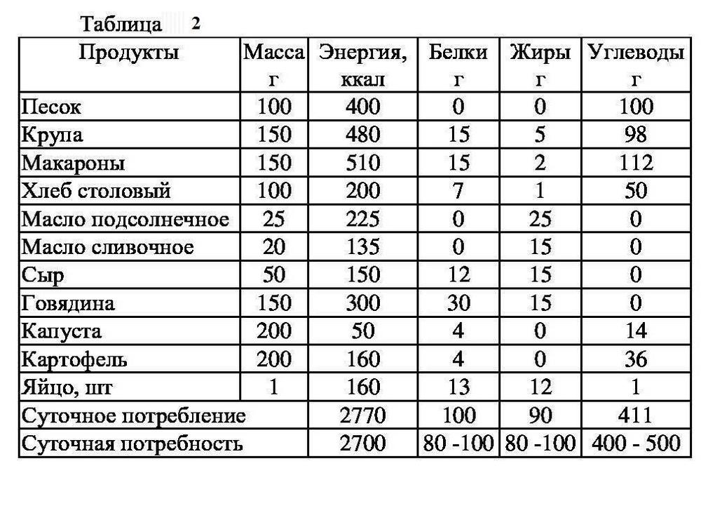 Приведенный базовый набор продуктов по основным компонентам удовлетворяет среднесуточную потребность среднестатистического мужчины (вес 70 кг) при малых физических нагрузках. Более полный перечень основных продуктов питания приведен в Приложении 1.