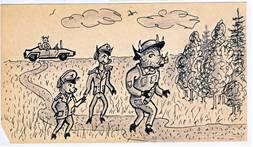 Подрастая, наши свинки стали выбегать за забор фермы. Ведь вокруг было столько интересного! И вот однажды, решив пойти на разведку в ближайший лес, Хрюшон и два его брата договорились встретиться рано утром на опушке. Хрюшон пришел раньше всех и, сидя на пеньке, сочинял стихи и поджидал своих родственников.