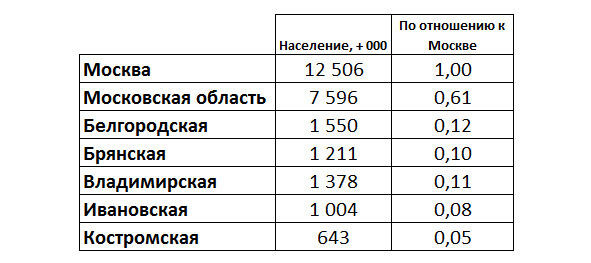 В таблице ниже представлены абсолютные цифры населения по областям и пропорции по отношению к Москве (население Москвы принимается за 1, пропорции определяются делением населения областей на население Москвы 12 506 тысяч, если верить интернету).