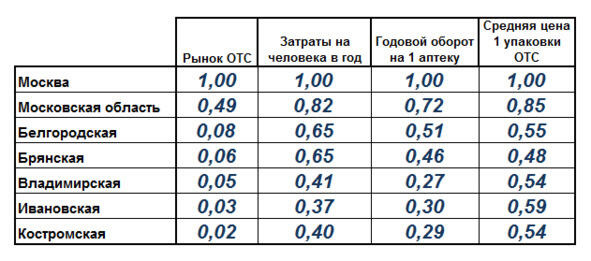 Таблица ниже иллюстрирует это. Если ввести дополнительные параметры (например, для безрецептурных препаратов общий рынок ОТС, затраты на человека в год на препараты ОТС, годовой оборот таких продуктов на 1 аптеку в территории и среднюю цену упаковки на безрецептурный препарат), ситуация несколько изменится: