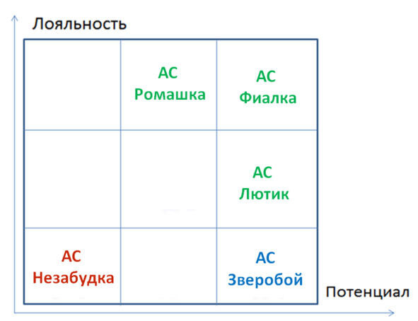 Аналогичным образом классифицируются и все остальные клиенты КАМа. Затем они распределяются по таблице «Потенциал Лояльность» по 9-и квадратам, что даёт нам 9 разных типов ключевых клиентов.
