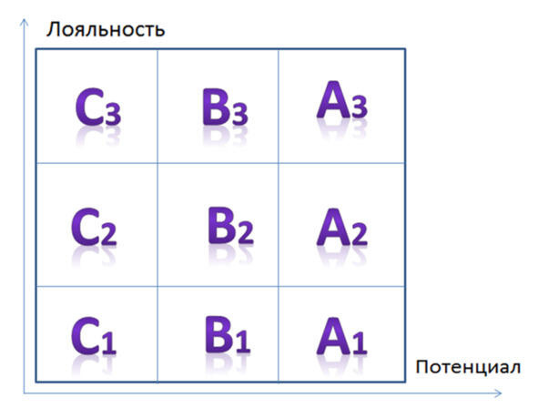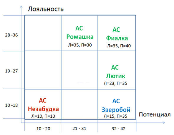 Максимальный уровень лояльности 35 баллов, минимальный 10. Так как у нас матрица содержит по 3 квадрата для каждого параметра, цена деления шкалы считается следующим образом: от максимума (35) надо отнять минимум (10) и поделить на 3. (3510) /3, что даёт нам шаг примерно «8». Следовательно, первый квадрат в параметре «Лояльность»: от 10 (наименьшее значение) до 18 (10 +8 как шаг на шкале), второй от 19 до 27, третий от 28 до 36.