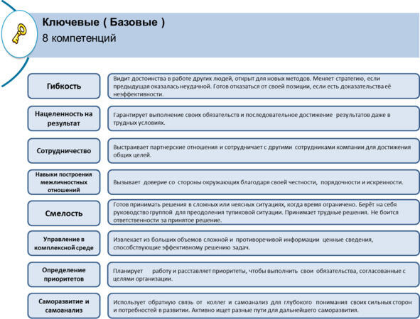 Гибкость. Без наличия такой базовой компетенции невозможно вести переговоры с клиентами. Отсутствие этой компетенции является абсолютным противопоказанием для занятия должности менеджера по работе с ключевыми клиентами. Не стоит путать «настойчивость» с «негибкостью», это две большие разницы.