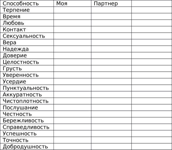 Заполните анкету по трёхбалльной системе: свои способности +++ или -, а также способности своего партнёра.