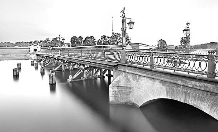 Позже, в 1738 г., когда стало ясно, что крепости не придется участвовать в боях и выдерживать осады, мост перенесли выше по течению, напротив Иоанновского ревелина. Береговые пролеты нового моста стояли на каменных арках, а центральную часть было решено «для чрезвычайной глубины построить на сваях, с подъемным постом». Впоследствии отдельные части моста неоднократно заменялись, но только в середине ХХ в. деревянные прогоны были окончательно заменены металлическими балками, мост украсили торшеры с фонарями и он приобрел современный вид. До 1887 г. мост назывался Петровским, позже его переименовали в Иоанновский.
