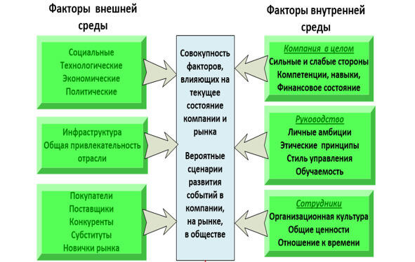 На этом этапе нужно проанализировать текущее состояние компании и рынка. Сложный и ответственный этап работы. Аналитику можно сделать разными способами. Анализ рынка, если слабая маркетинговая служба можно заказать. Можно создать рабочую группу внутри компании. Областей анализа много. Важно учесть все факторы, которые влияют на развитие организации.